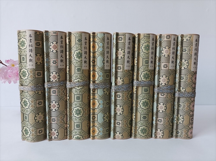 ④册页、碑帖。一般画心小而数量多的可分别裱成开版册页或推篷册页。开版册页的画心在右开,题诗则在左开,天头稍比地头大,立柱、分心与地头基本相同。推篷册页的画心裱在下开,题诗裱在上开,天头与地头大小相等,立柱与分心的宽度相同。装裱册页多用罗纹纸镶嵌,洁净古雅。册面可以织锦或缂丝糊制,也可用楠木或红木制作。裁刺册页刀口要整洁。将碑文裱成一本本的开版册页,称做“碑帖”。裱帖规格与裱册页相似,但程序较多,首先要等定每行字数,每页若干行以及抬头、年月、落款及首尾附题小跋的位置,画好样式,再行装裱。裱帖要备制墨纸,以供补缝,也应选配名纸作前后副页。五镶经折的裱式,不用绫绢而用宣纸作镶料。
